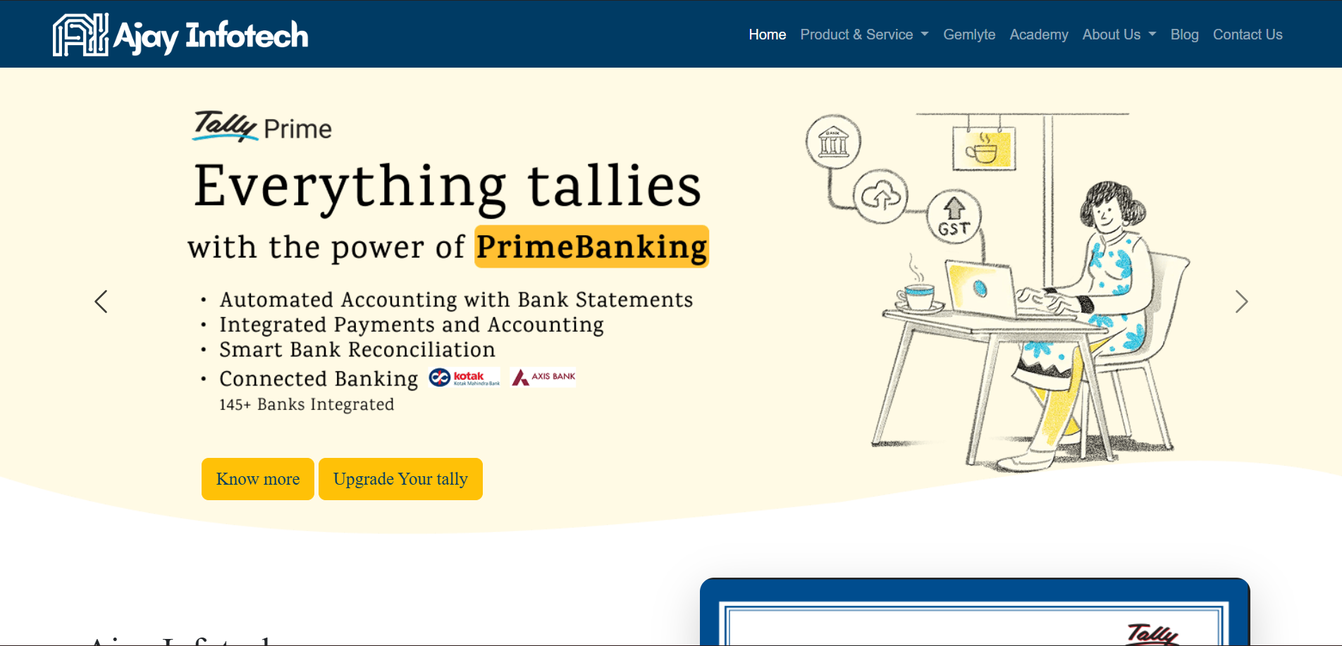 To elevate Ajay Infotech’s digital presence, we developed a professional static website that clearly communicates their journey, services, and strong client relationships. Our goal was to showcase their credibility as a leading Tally Prime partner through a well-structured layout, impactful messaging, and trust-building elements.